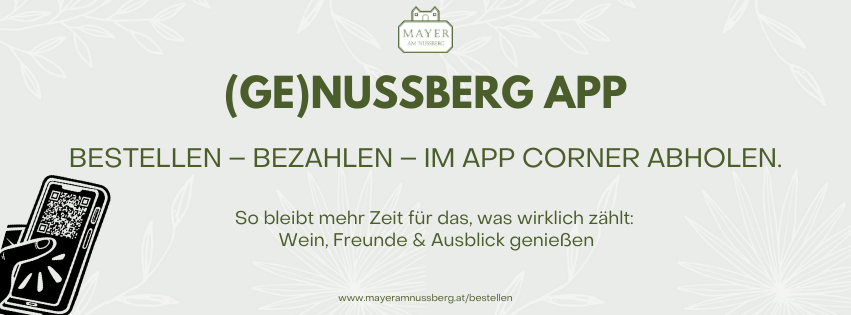 Bitte beachtet, dass unser Mayer am Nussberg eine reine Schönwetterlocation ist und wir ausnahmslos keine Doppelreservierungen (Schönwetter Mayer am Nussberg / Schlechtwetter Mayer am Pfarrplatz) annehmen – solche Reservierungen werden ohne weitere Information aus unserem System beim Mayer am Pfarrplatz gelöscht – vielen Dank für eurer Verständnis.